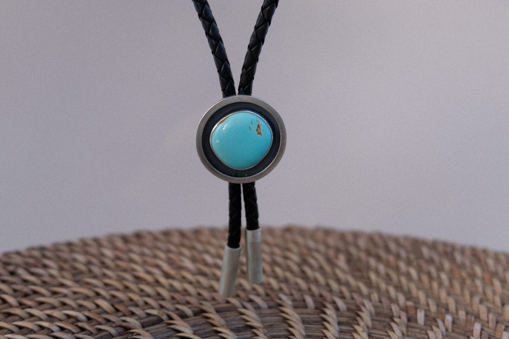 A modern take on a bolo tie. Created with a Cairco Lake Turquoise stone, sterling silver, and premium 4mm leather braided cord. Bolo tips are handmade to add to the modern feel.