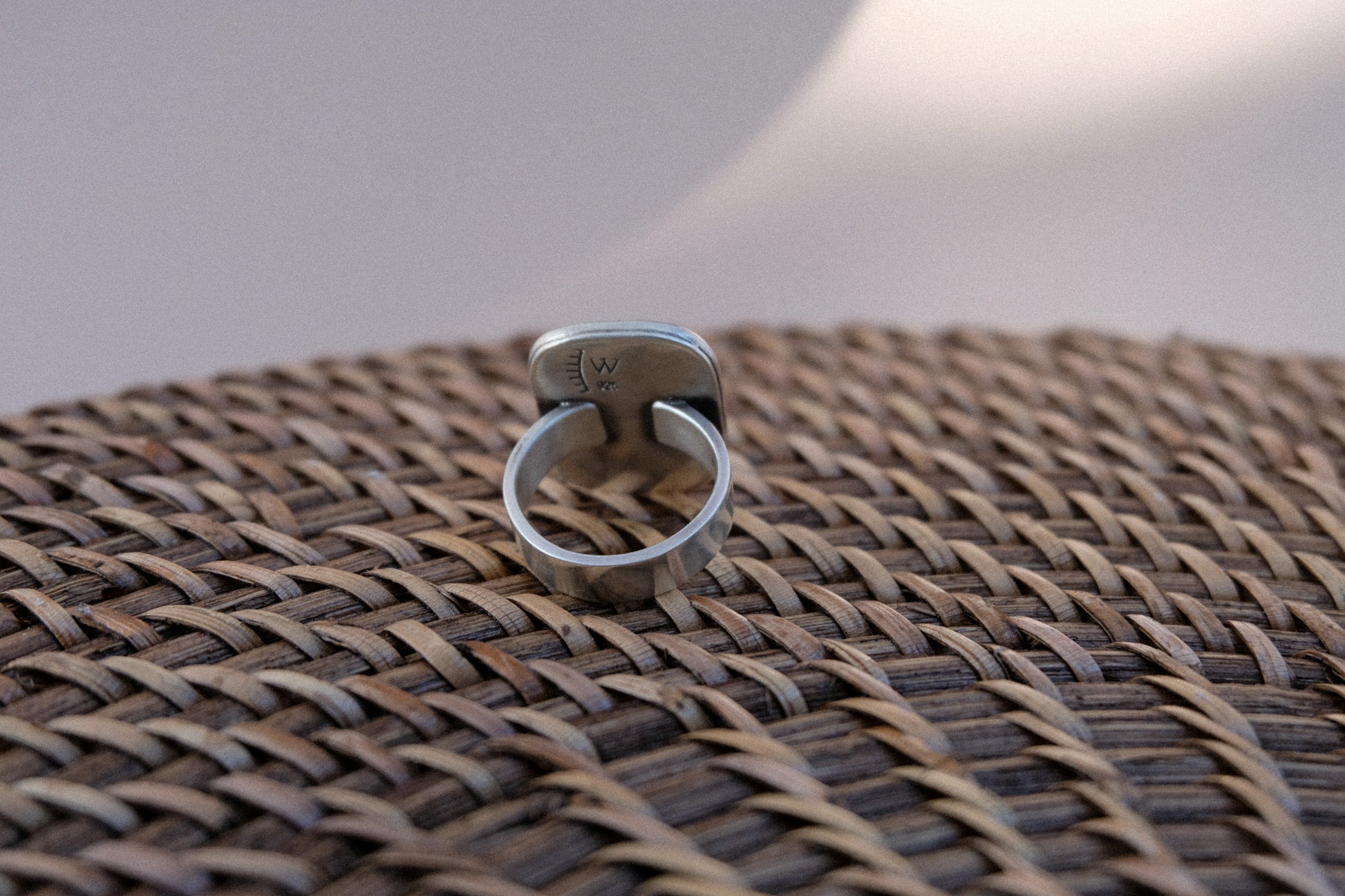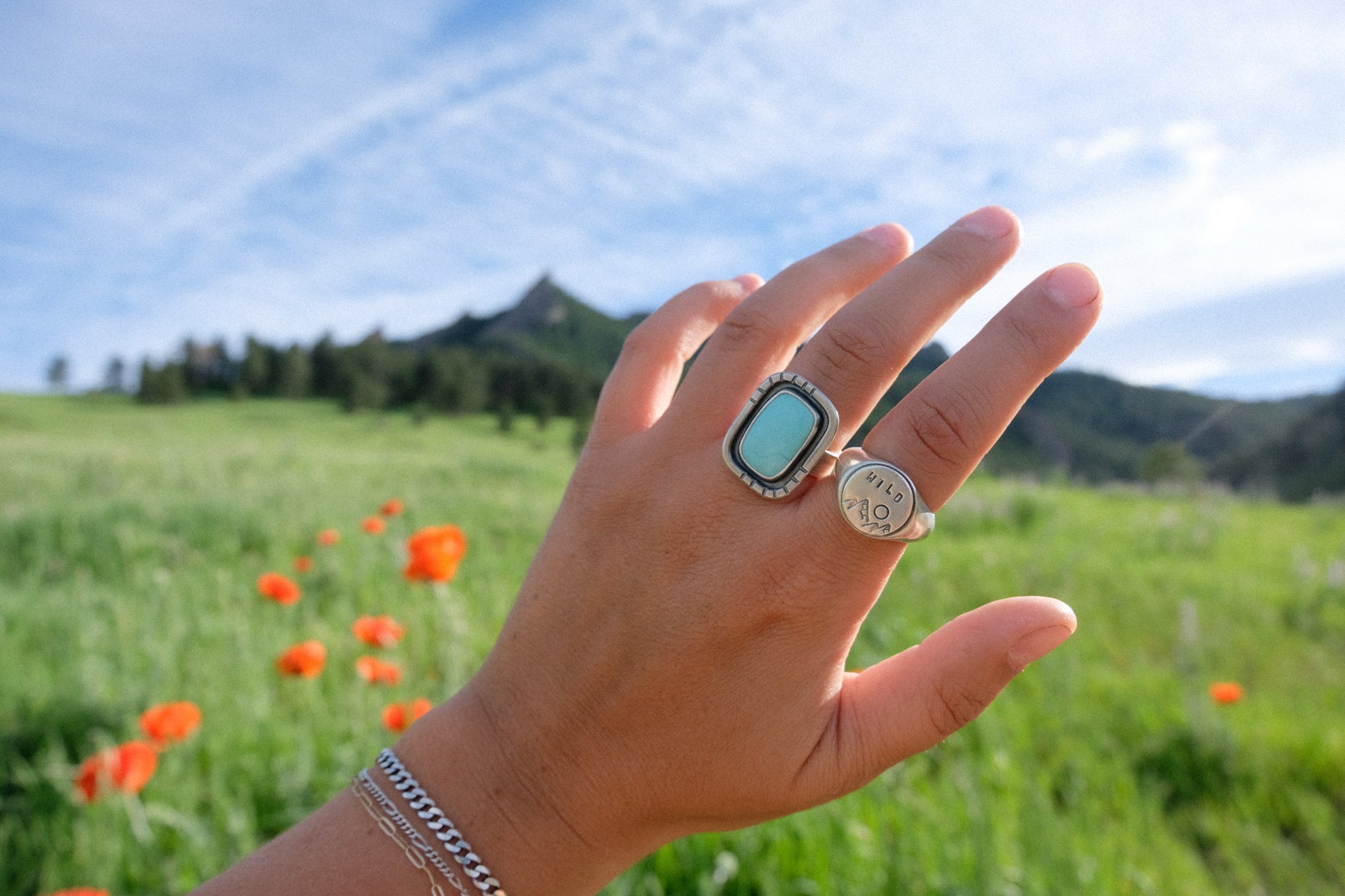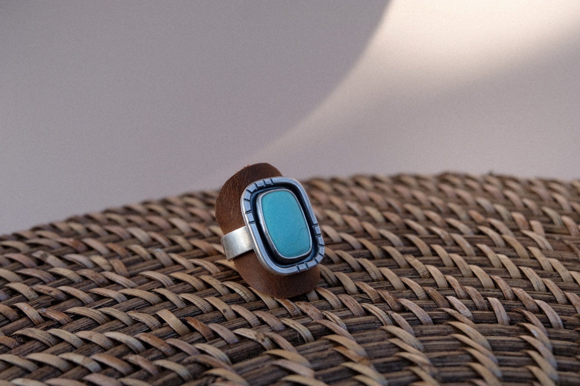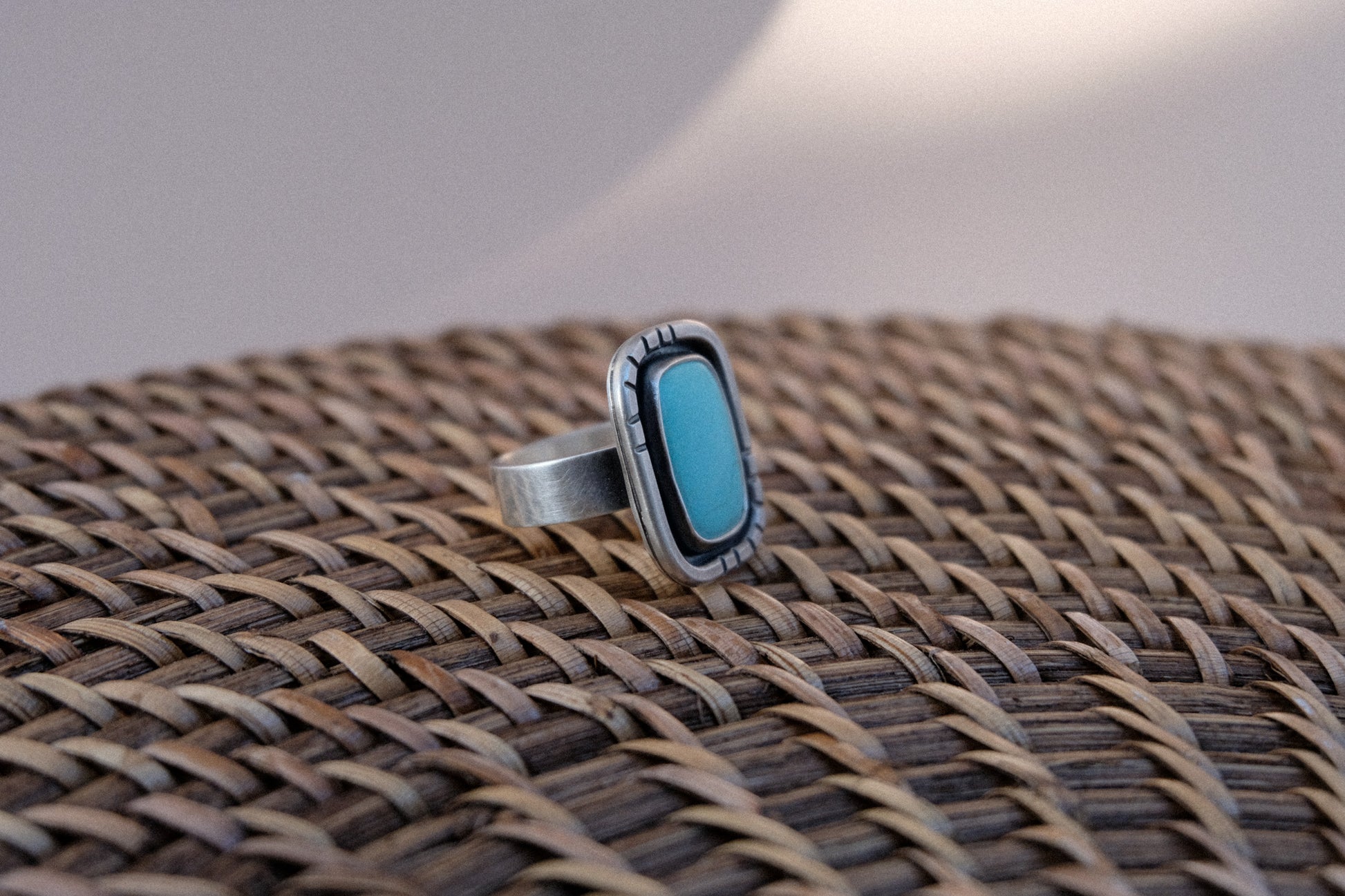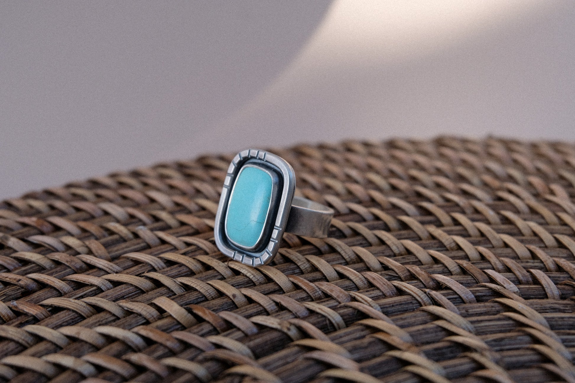 This Cairco Lake turquoise ring will make a statement with its bright blue color and clean style. It features the signature Westry border style and line detail surrounding the ring. Made with sterling silver and my own two hands.
