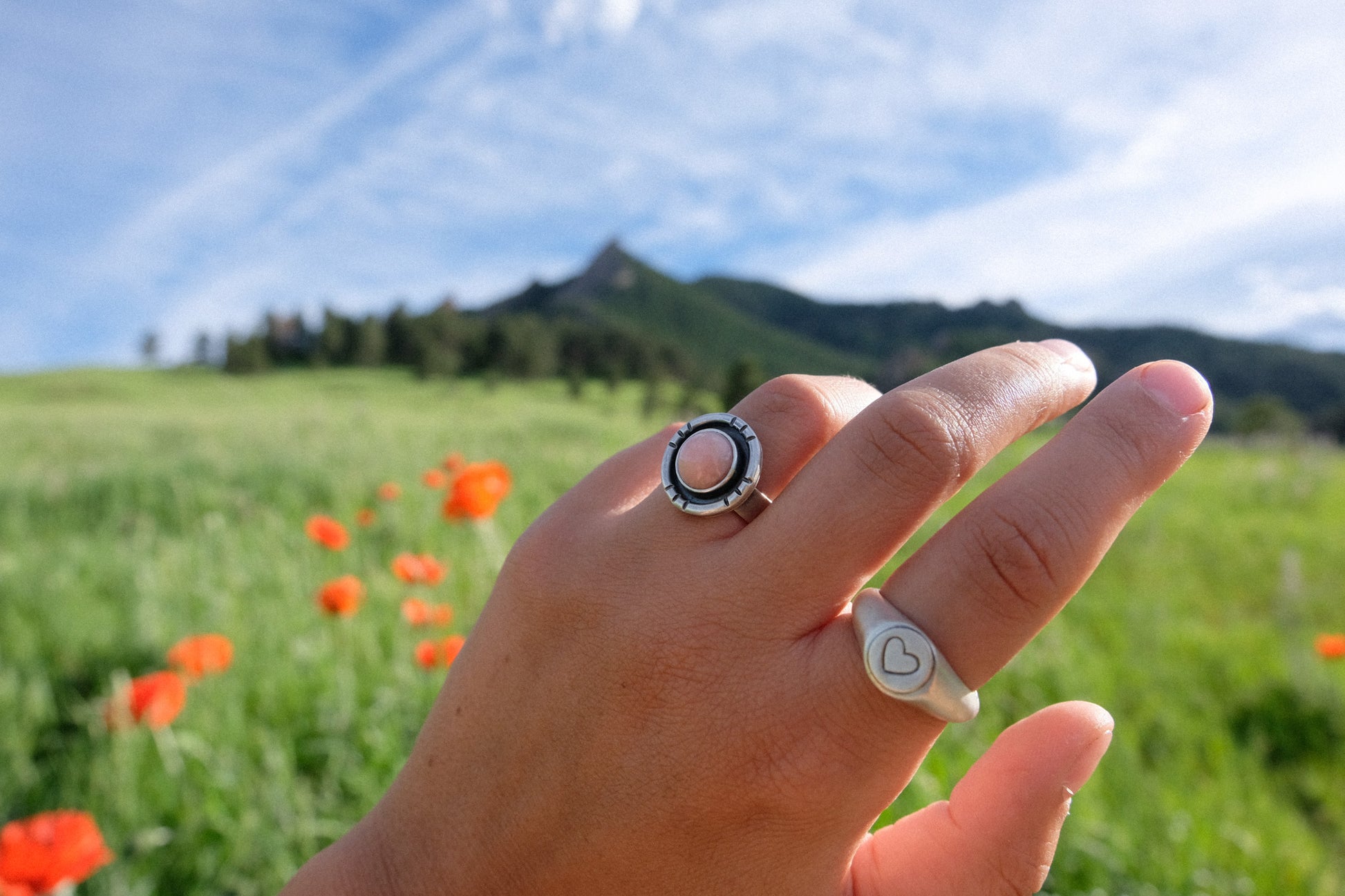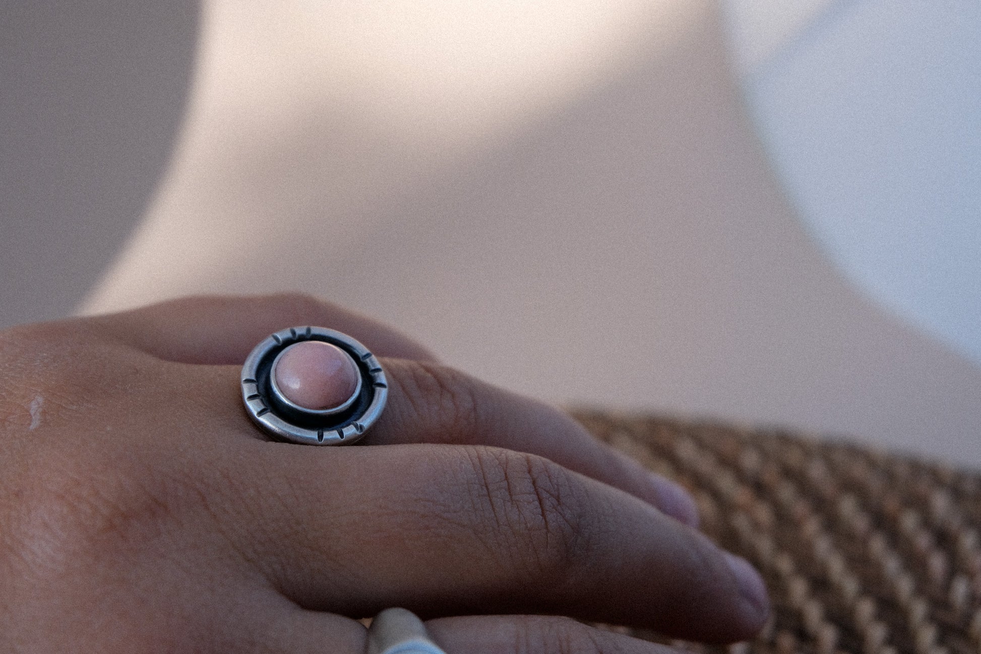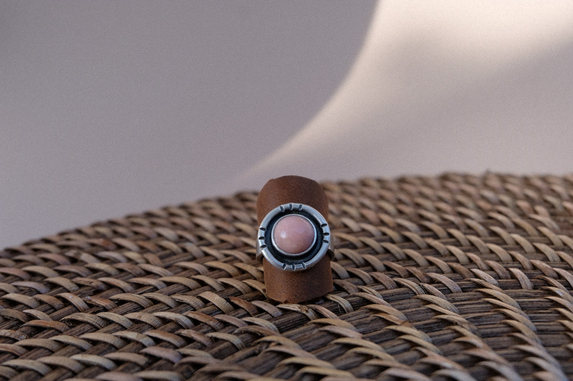 This pink opal ring will add a pop of color with its bright pink color and clean style. It features the signature Westry border style and line detail surrounding the ring. Made with sterling silver and my own two hands.