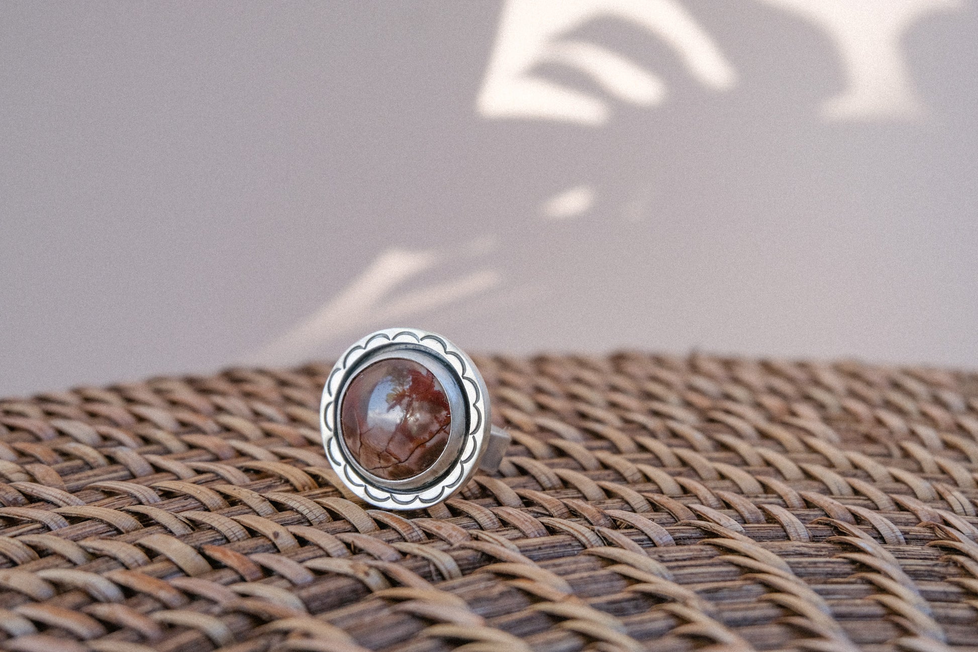 This red falcon jasper ring will make a statement with its deep red and brown color and clean style. It features the signature Westry border style and stamped detail surrounding the ring. Made with sterling silver and my own two hands.