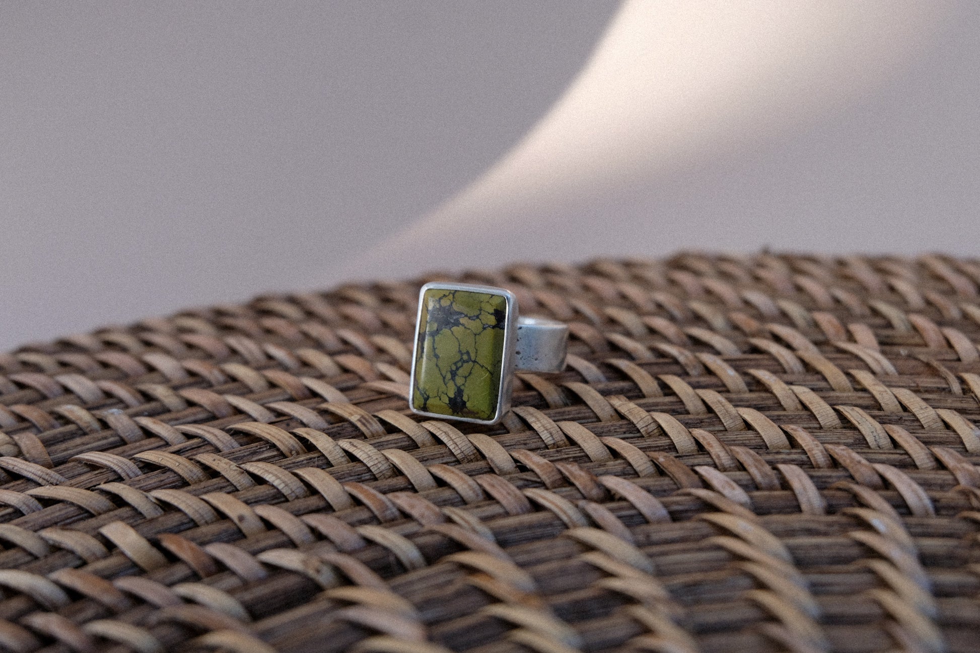 This turquoise ring contains a stunning green stone with a complex matrix. The clean, minimal style makes it easy to wear on any occasion. Made with sterling silver and my own two hands.